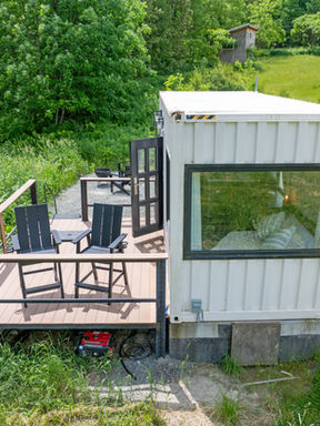 Escape to a modern studio container home nestled up against the woods of Littleton, New Hampshire. Floor-to-ceiling windows showcase stunning White Mountain views, while a sleek kitchenette, cozy sleeping area, and spa-style bathroom create the perfect retreat. Step onto your private deck to enjoy coffee, dinner, or stargazing by the fire pit — a serene blend of nature and contemporary comfort.